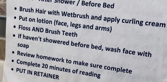 Over the weekend, I attended a house re-warming party for some friends who had their home remodeled. The updates were impressive, but I was struck by something incredibly simple in the hall bathroom, taped to the tile on the wall: their daughter’s bedtime checklist. The list includes both hygiene/personal grooming…